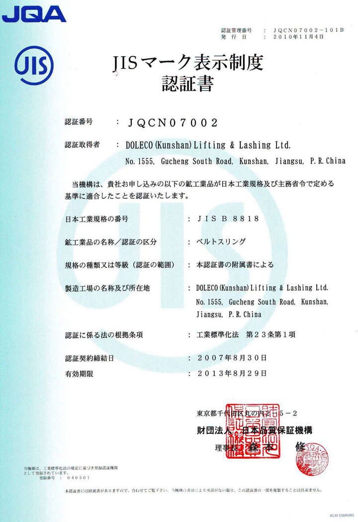 2010年6月7日-12日,日本JIS品质认证机构(JQA)一行又来到德莱奇(昆山)公司,对该公司生产的“多来劲”吊索具进行第二次JIS产品认证,经过六天严格全面的考核,德莱奇公司再次顺利通过该项认证。日前,德莱奇(昆山)公司正式收到了JQA颁发的JIS认证书。